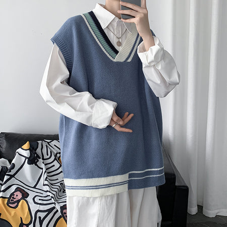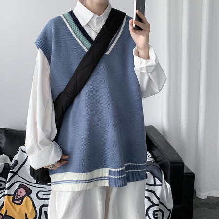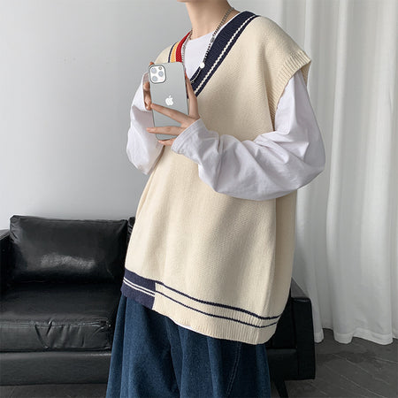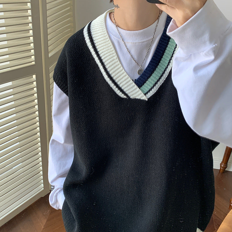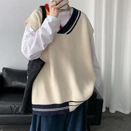 Sleeveless Sweater – Contrast Color College Style Knit Vest