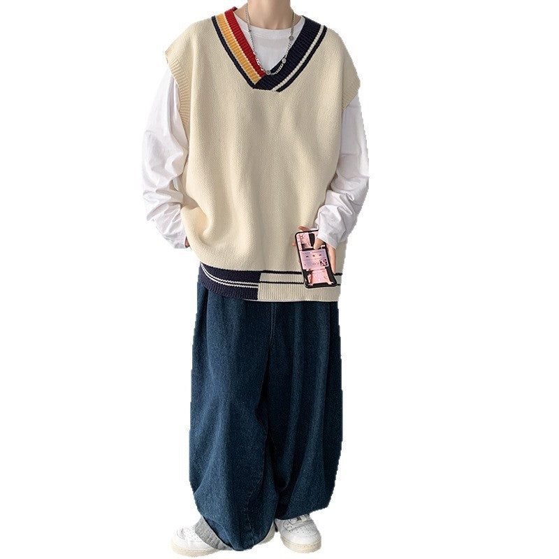 Make a statement this season with this fashion brand sleeveless sweater vest, featuring an irregular contrast color design for a bold, college-style aesthetic. Perfect for men who want something beyond the ordinary.