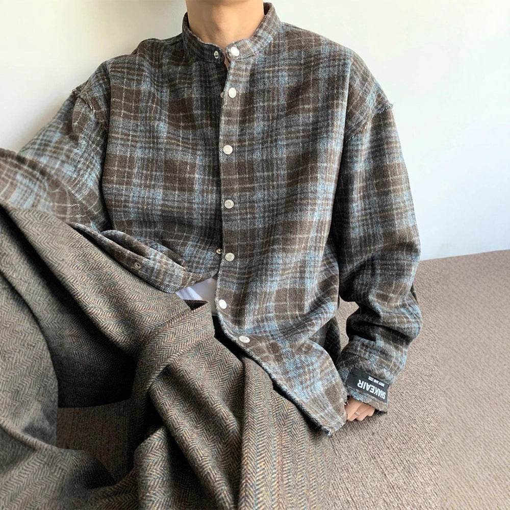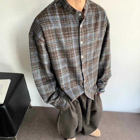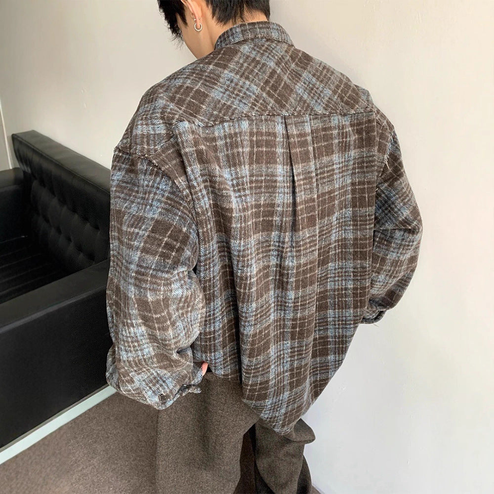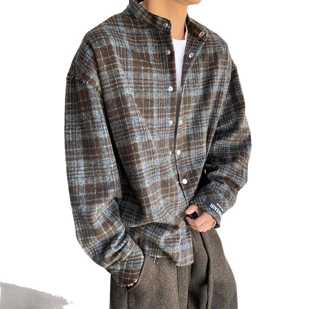 Add vintage charm to your wardrobe with this American retro plaid men’s overshirt, designed in a stylish blue and coffee color blend. Perfect for spring layering, it combines laid-back vibes with refined woolen texture.