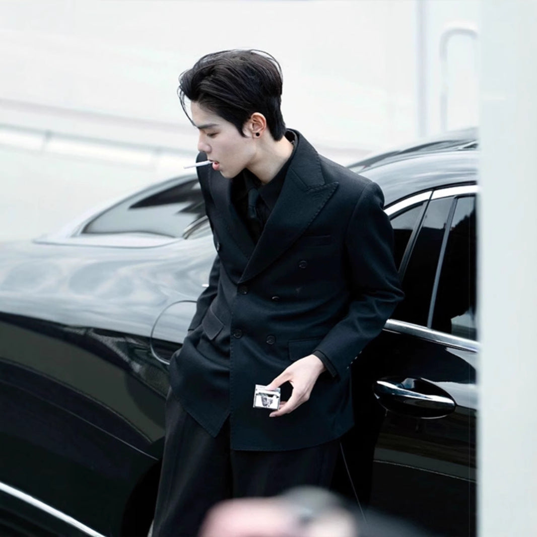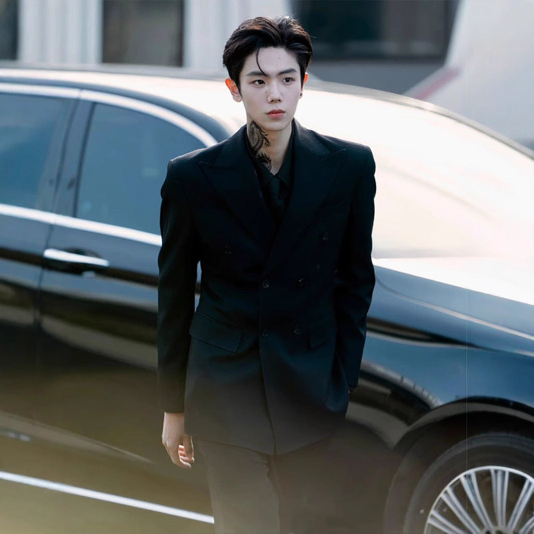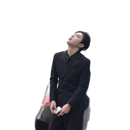 Command attention with this black men’s casual suit jacket, designed with a double-breasted British yuppie flair. Sleek and sophisticated, it’s a polished piece that blends modern high-end fashion with timeless elegance.