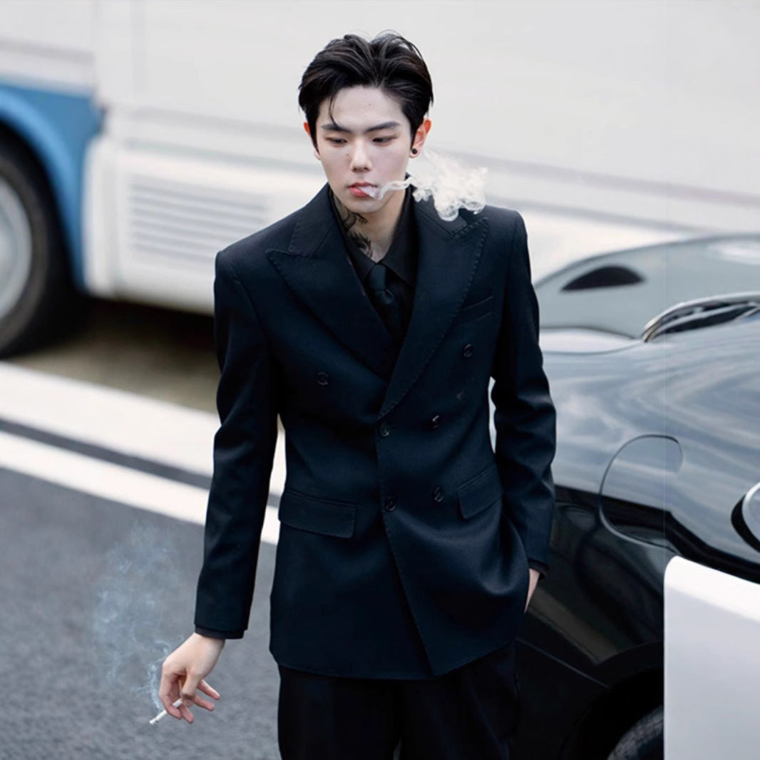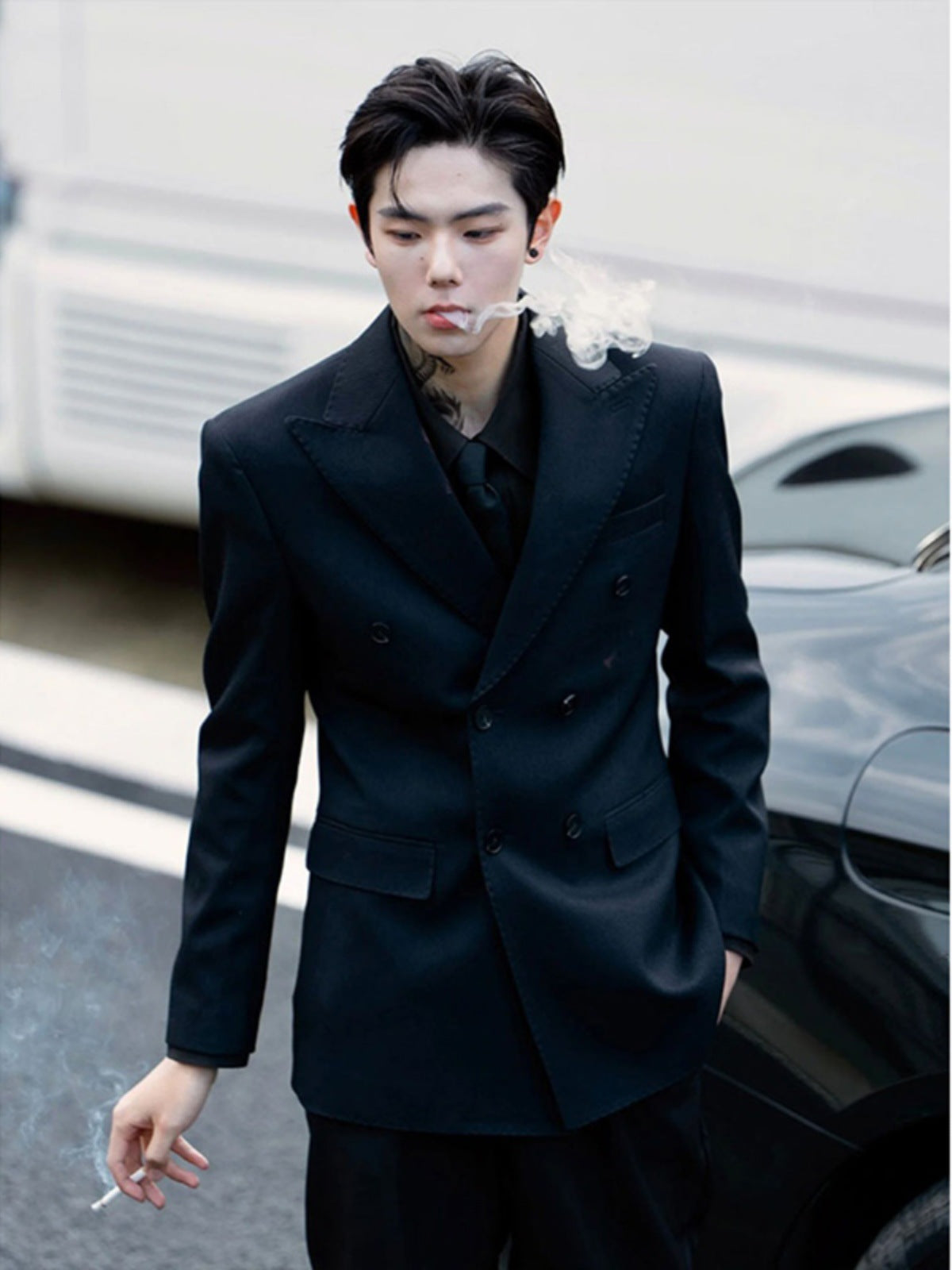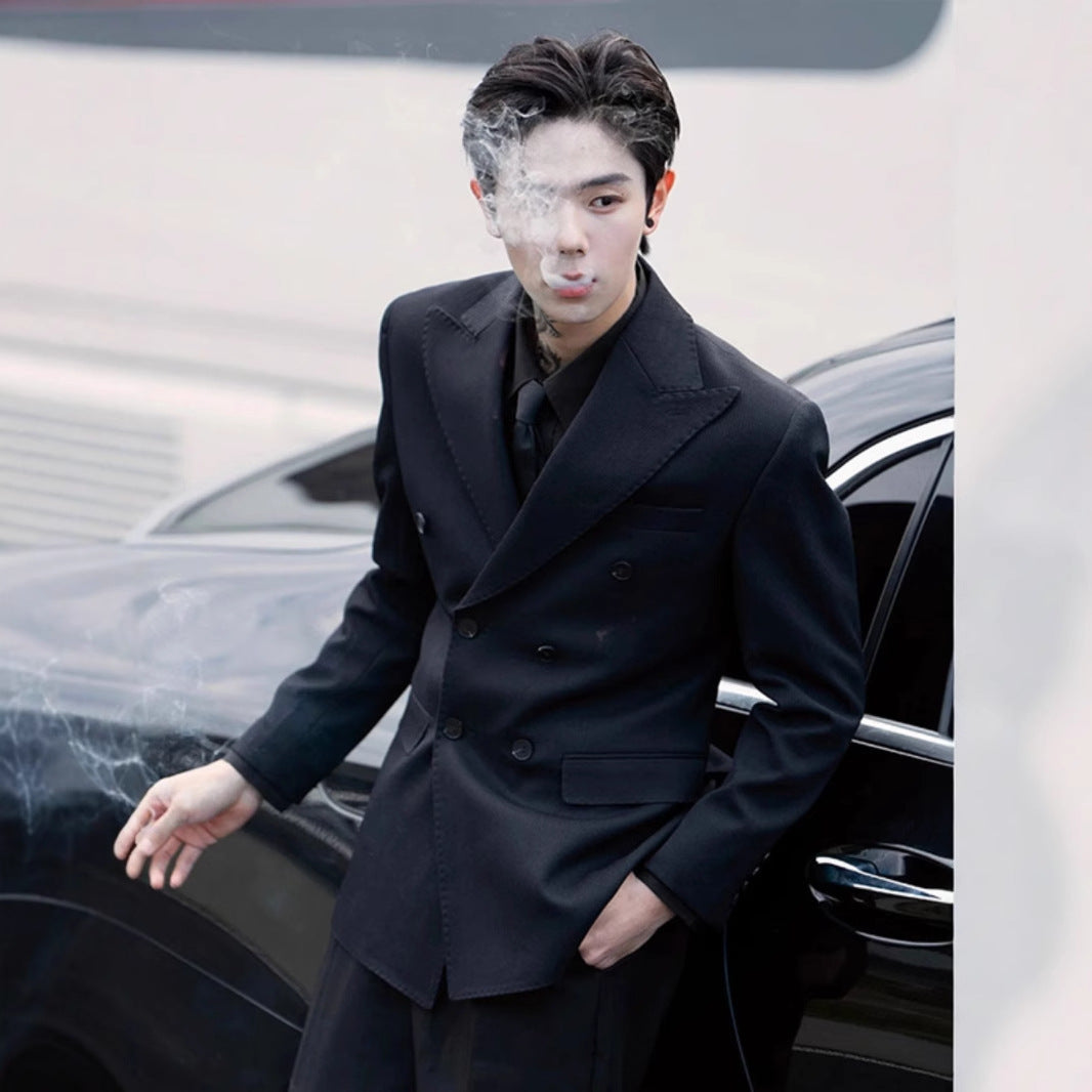 Black Double-Breasted Men’s Suit Jacket – British Yuppie Style