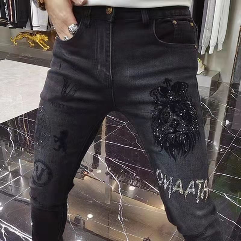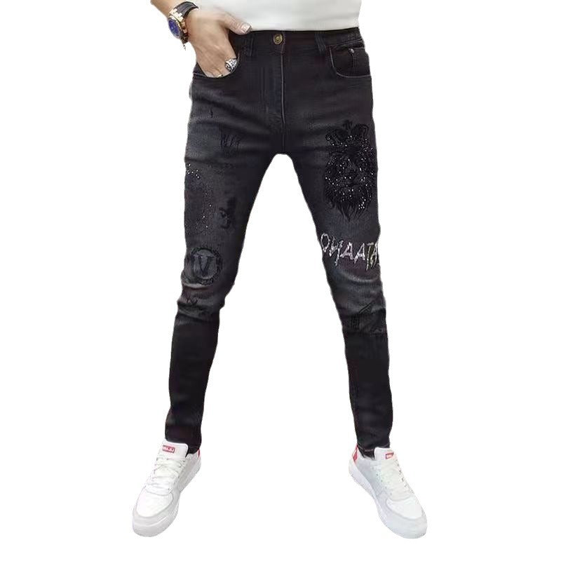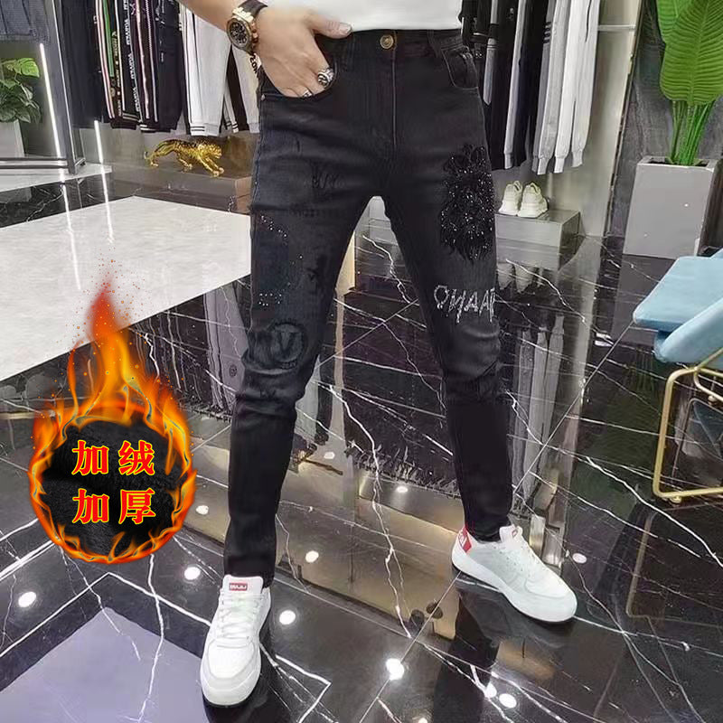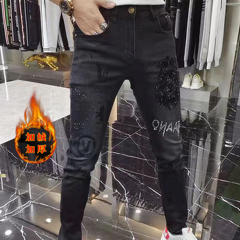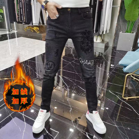 Black Slim Fleece Jeans with Rhinestone Embroidery