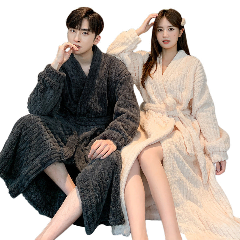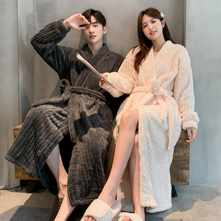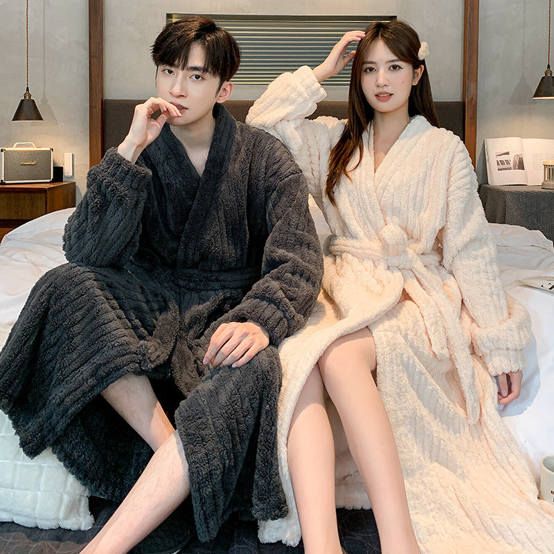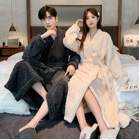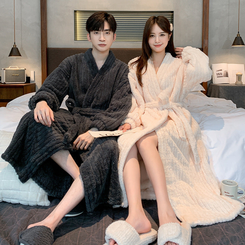Couple’s Winter Coral Fleece Bathrobe – Thickened Fleece-Lined Long Nightgown for Men