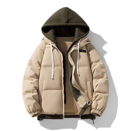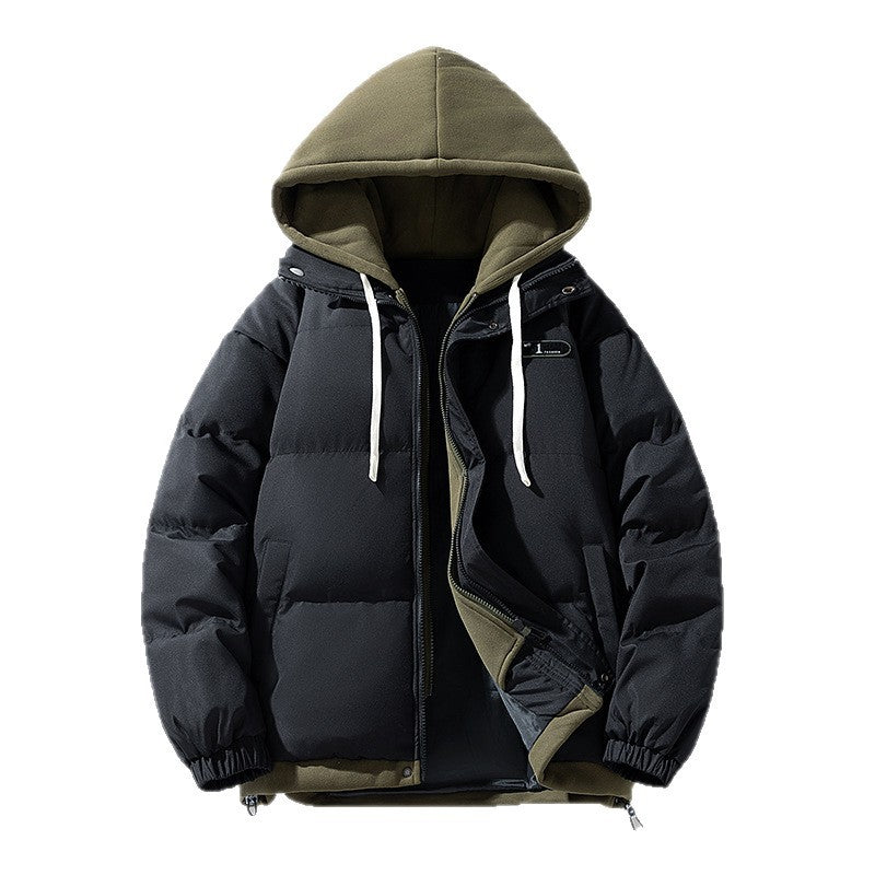 Men’s Hooded Puffer Jacket – Color Block Fake Two-Piece Style