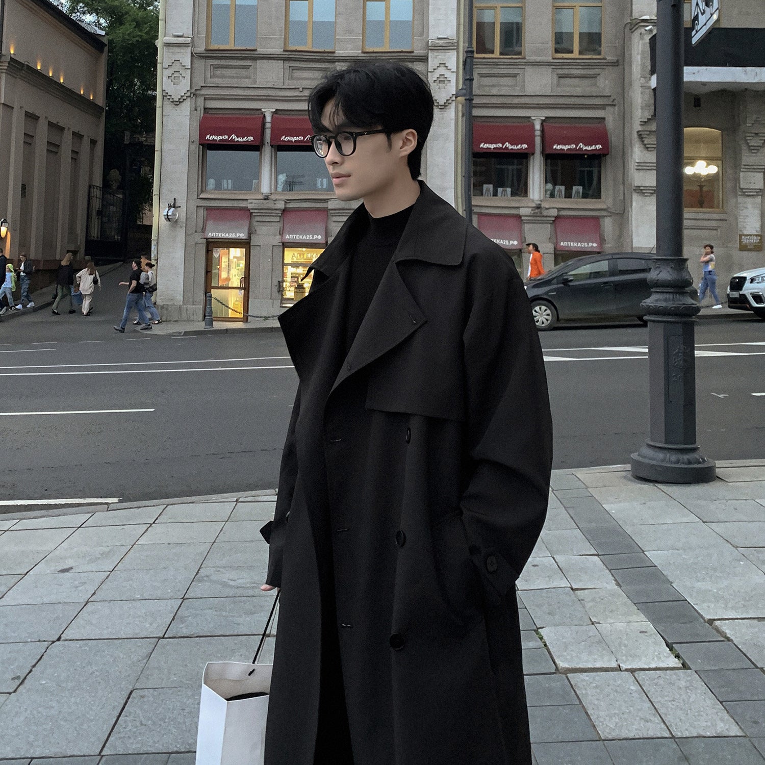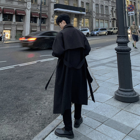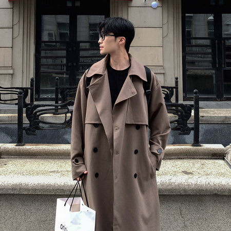 Belted Over-Knee Windbreaker – Korean-Style Men’s Double-Breasted Coat