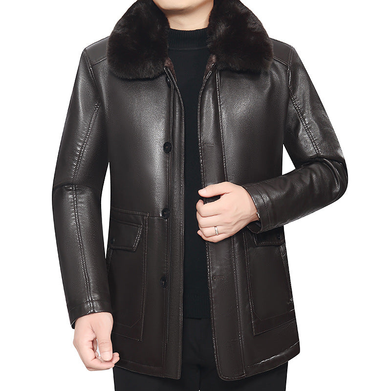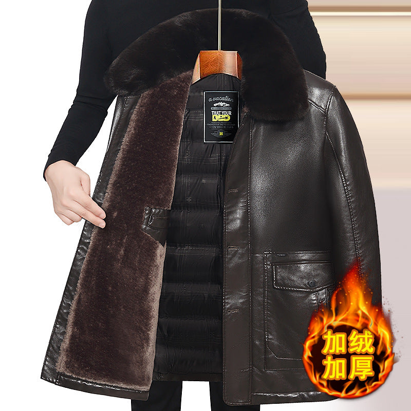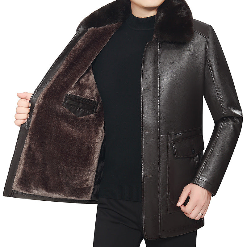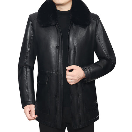 Men’s Mid-Length Leather Coat Fleece-Lined Dad Jacket