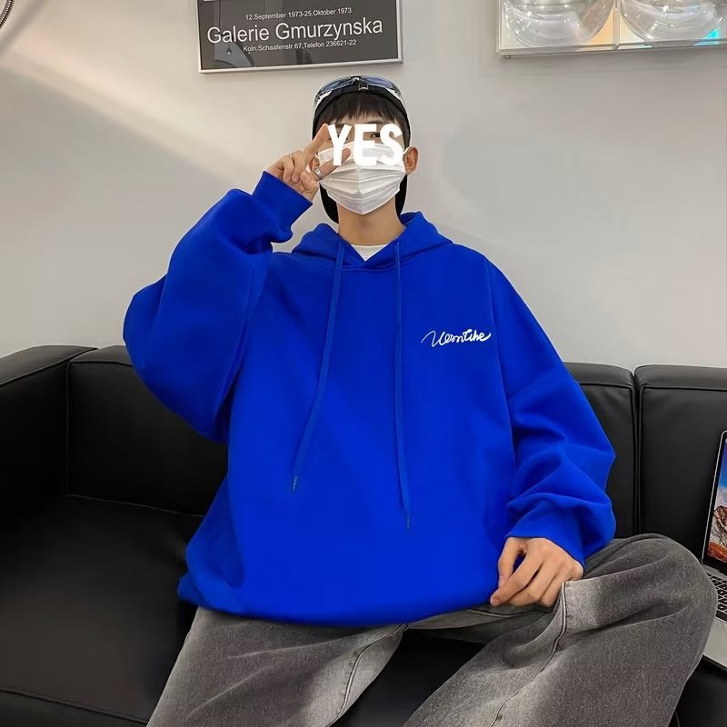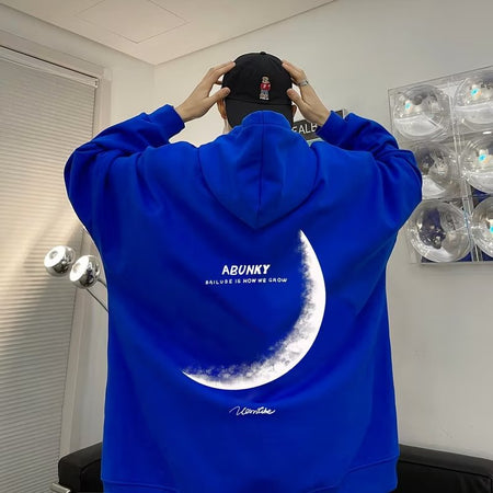 Shine under the stars 🌙 with this moon print hooded sweatshirt for men. Featuring a Klein Blue design 💙 and loose American streetwear fit, this hoodie is bold, modern, and effortlessly stylish.