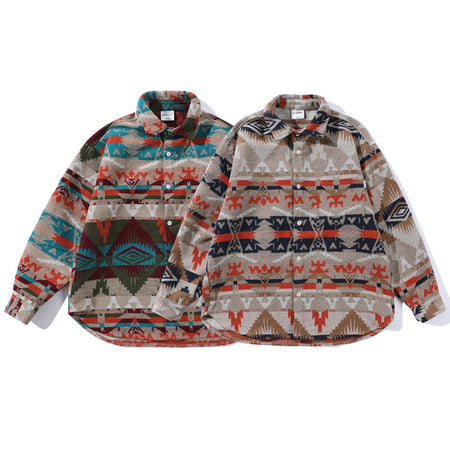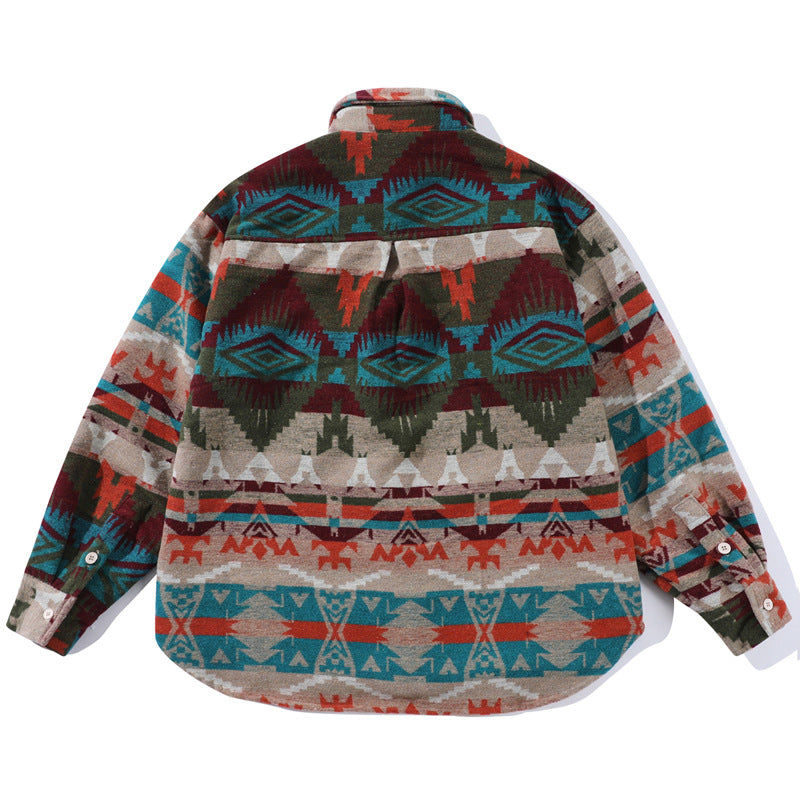 Embrace ethnic-inspired fashion with this Japanese vintage Navajo jacquard overshirt. Thickened woolen fabric provides warmth, while the artistic design makes it stand out.