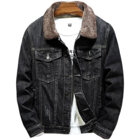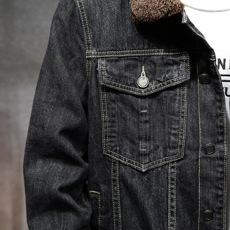Men’s Black Denim Jacket | Fleece-Lined Wool Collar Thick Winter Coat
