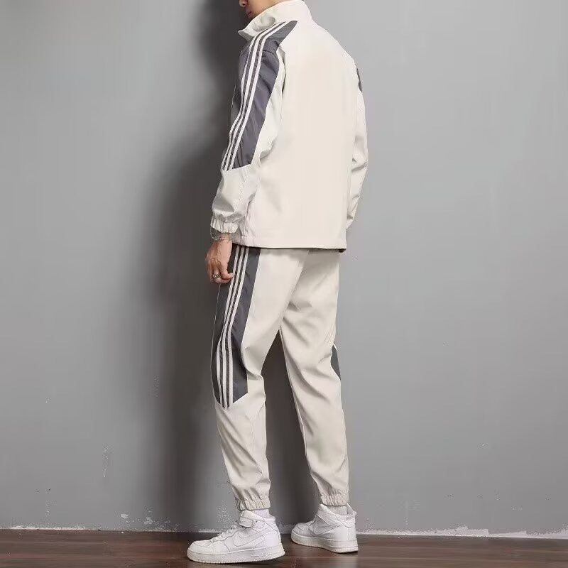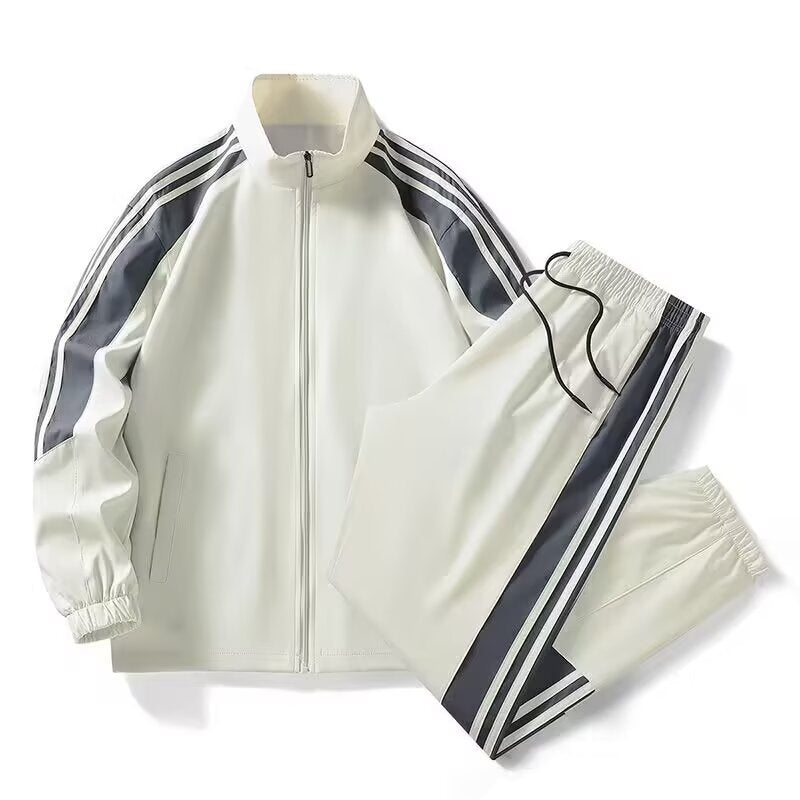 Modern Two-Piece Design: Stylish jacket with three-bar detailing paired with matching pants for a cohesive look.