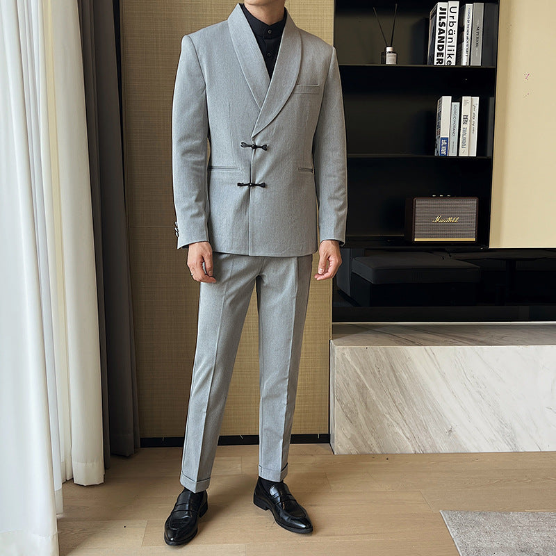 Celebrate your special day with the Men’s Chinese Style Wedding Suit, a unique fusion of modern slim tailoring and traditional Chinese button design. Perfect for grooms seeking a distinctive, elegant look. 🏮🐉