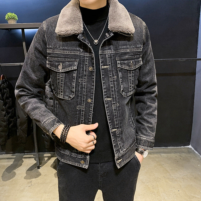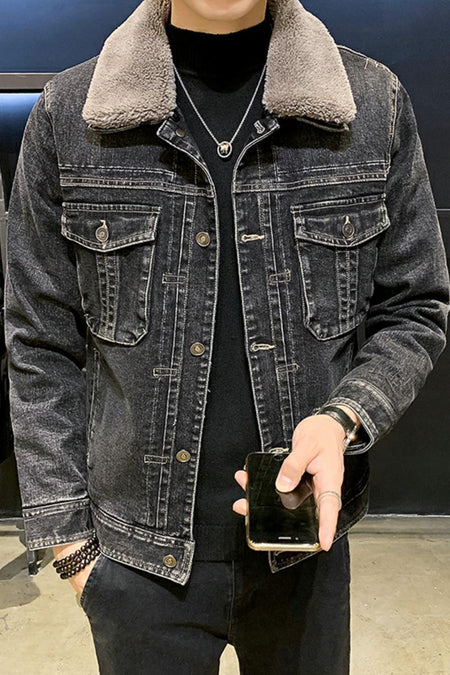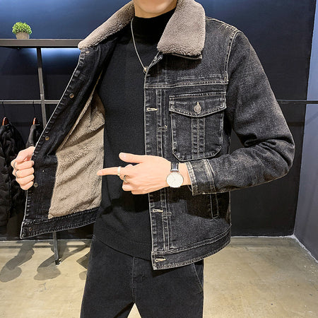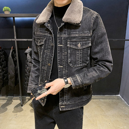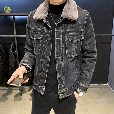 Men's Winter Denim Jacket Lamb Fur Collar Slim Fit Warm Coat