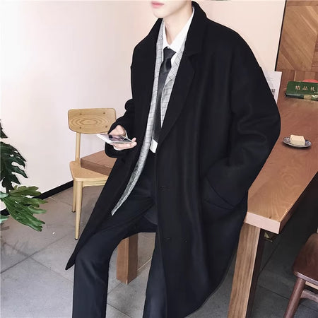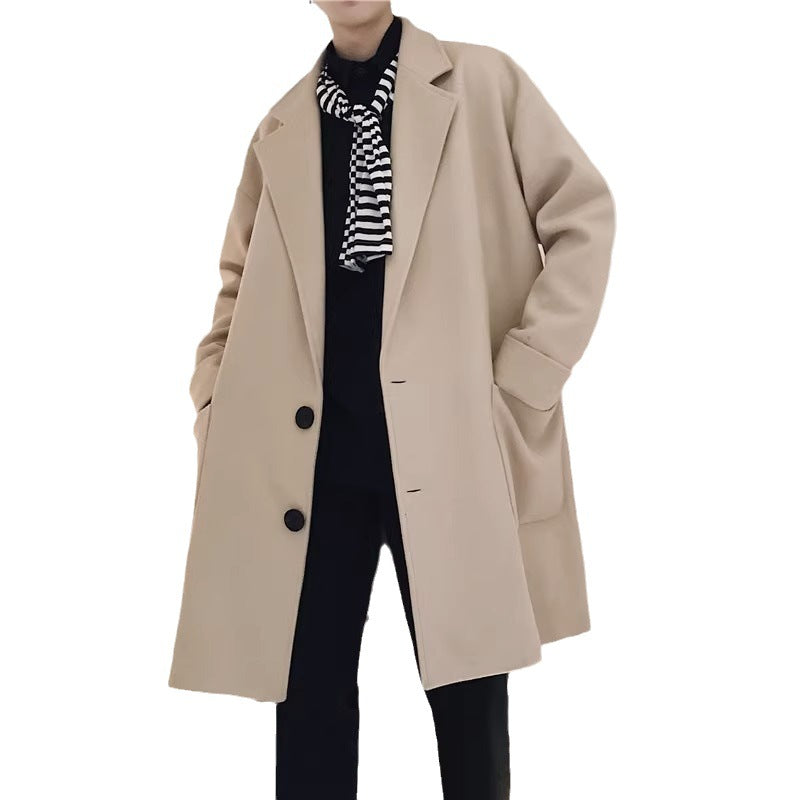 Upgrade your outerwear with this Korean-style wool overcoat, designed for spring and autumn layering. Featuring a mid-length cut with a loose, trendy silhouette, this coat delivers effortless style for students, professionals, and fashion-forward men. The wool-blend material offers light warmth, making it ideal for transitional weather.