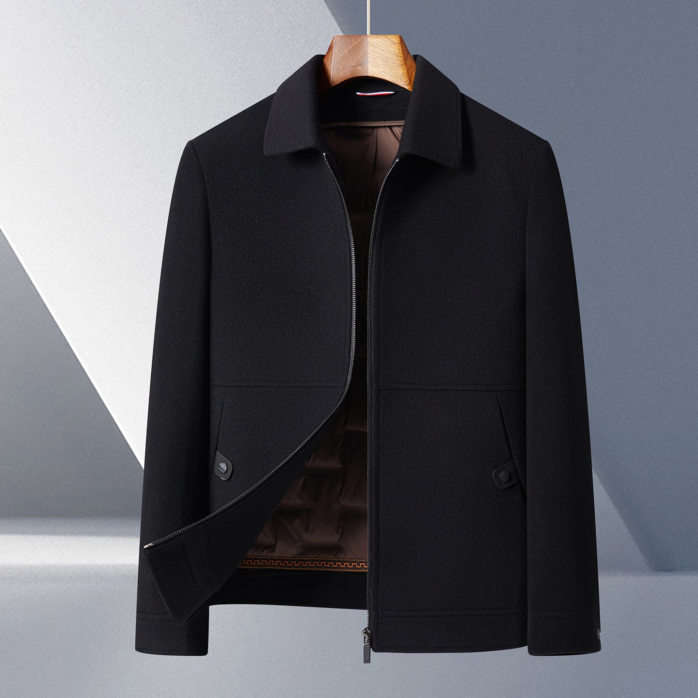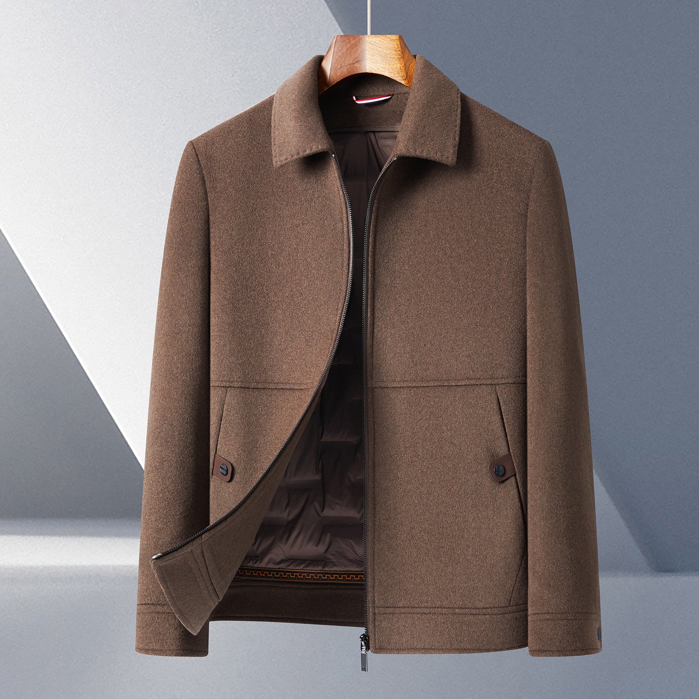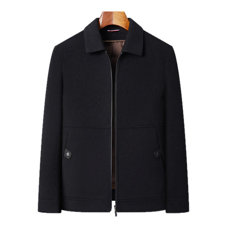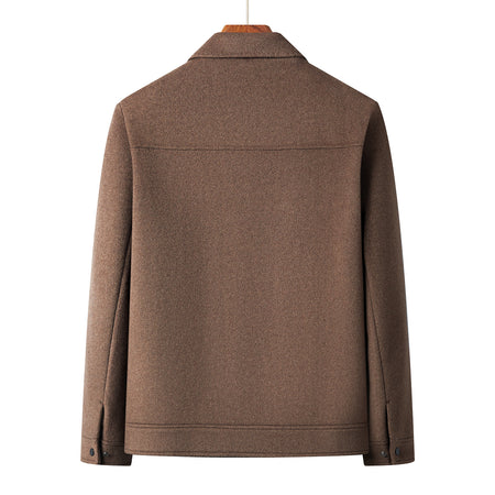 This dual-purpose wool and down business coat is designed for middle-aged and elderly men. With its detachable down liner, it can adapt to changing temperatures. The double-sided wool fabric ensures durability, warmth, and a neat business appearance.
