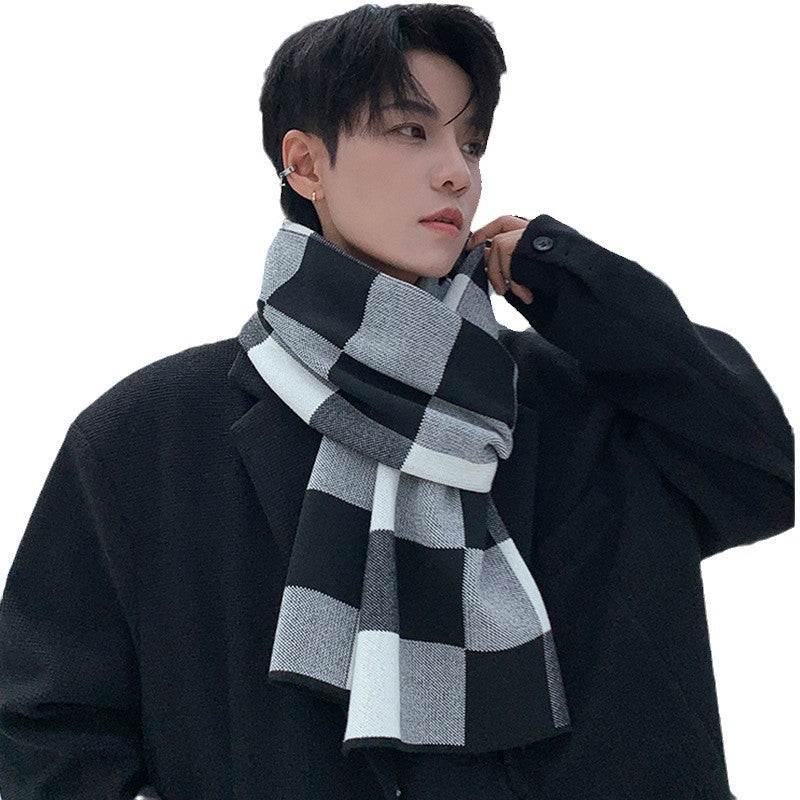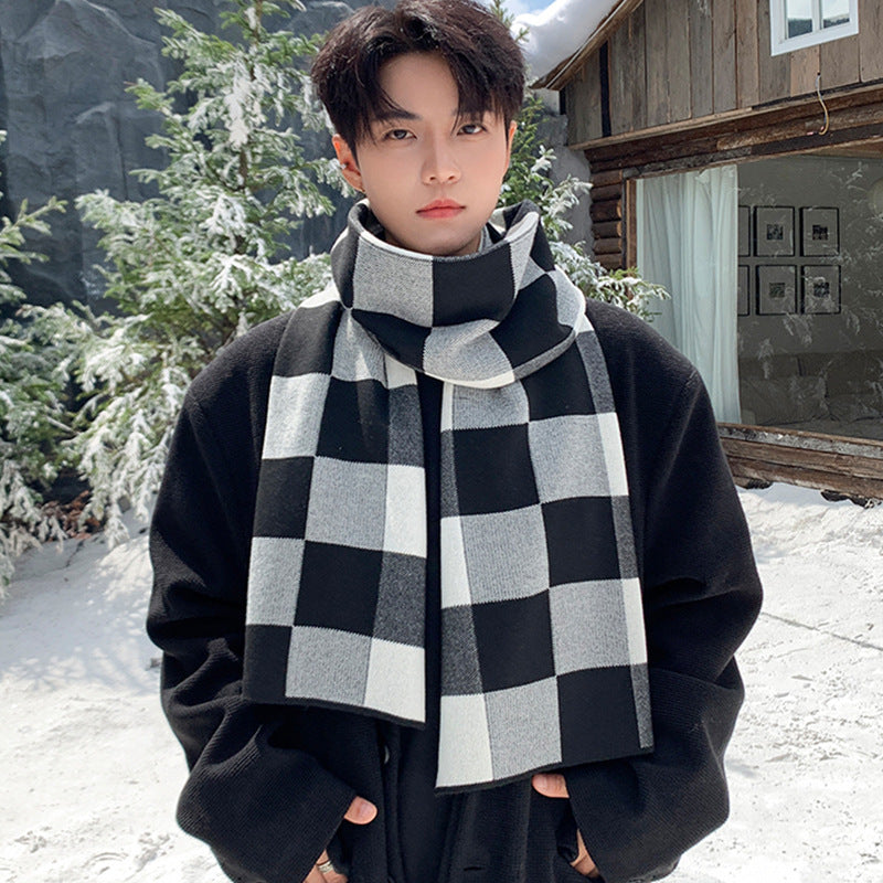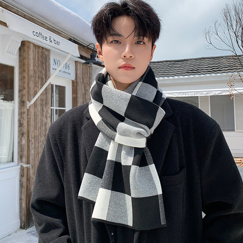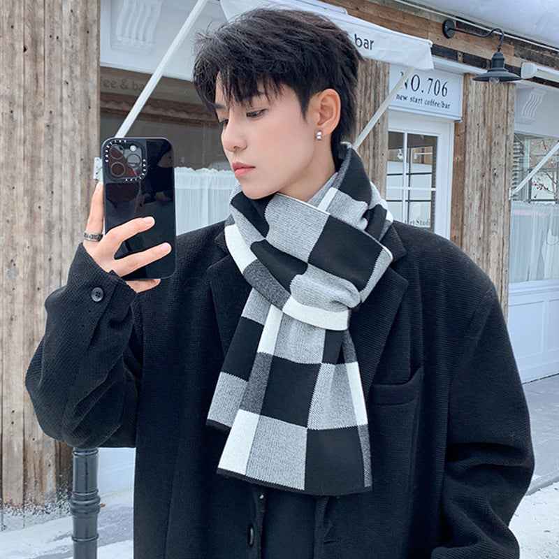 Stay cozy and on-trend with this men’s plaid knitted scarf, a stylish accessory that blends warmth and fashion. The double-sided plaid pattern makes it versatile for different outfits, from casual to Korean-inspired streetwear.
