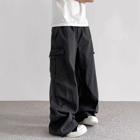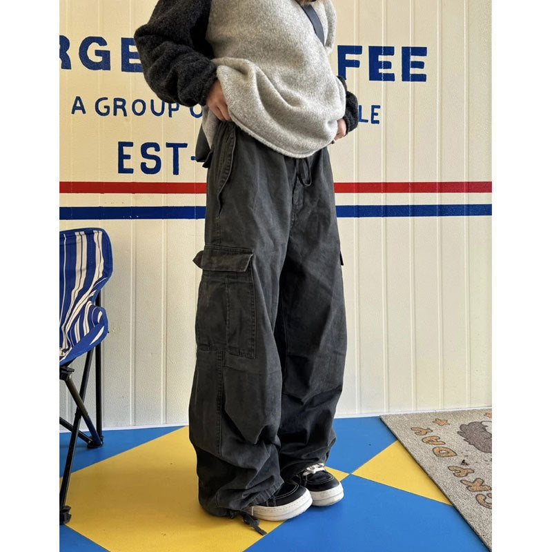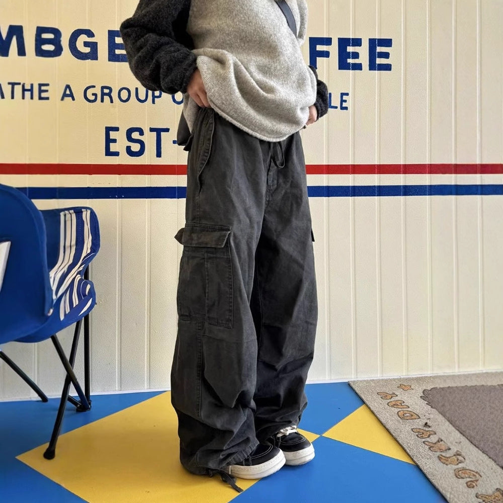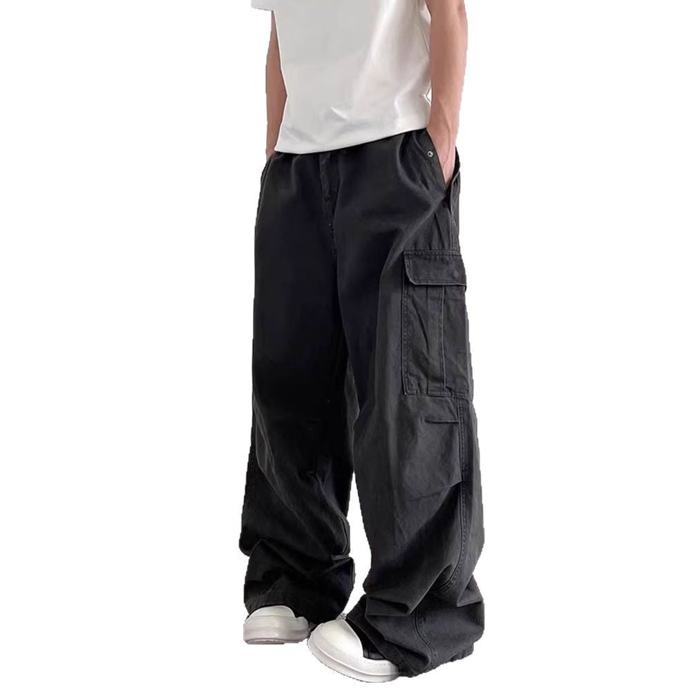 Bring a cool, laid-back vibe to your look with these washed black cargo pants for men, crafted in an American retro style. With a relaxed drawstring waist and wide-leg silhouette, they’re perfect for casual streetwear.