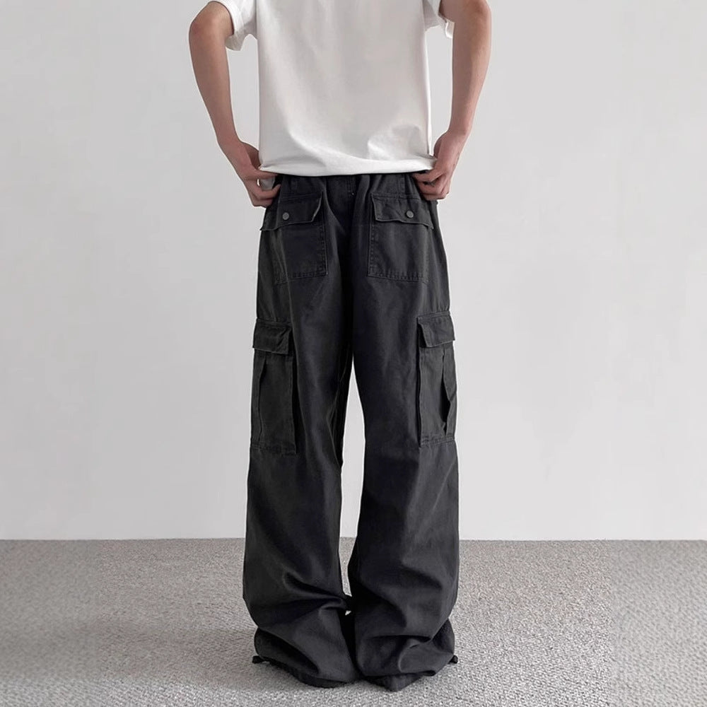 Retro Washed Black Cargo Pants Men’s Wide Leg Drawstring
