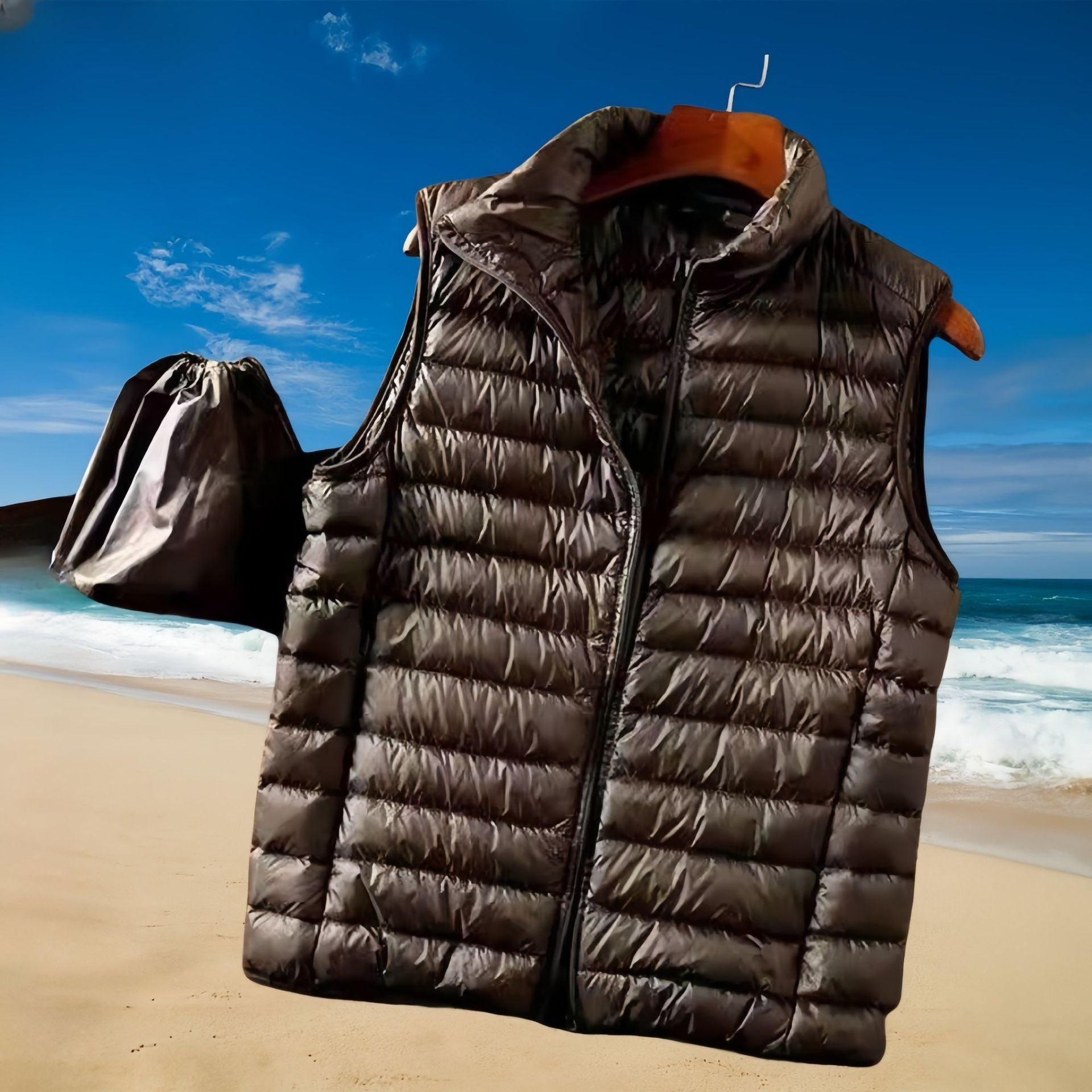 A sophisticated men’s down vest that proves winter wear can be both warm and stylish.
