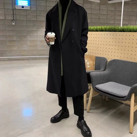 Men’s Woolen Pu Coat – Loose Mid-Length Double-Breasted Winter Coat
