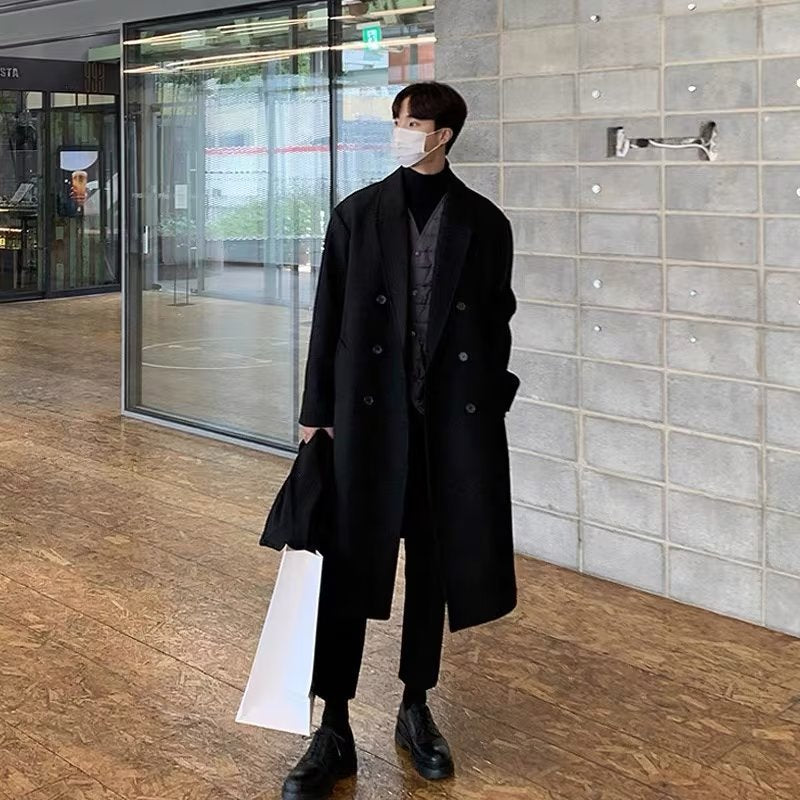 Stay cozy and stylish with this men’s Pu woolen coat, featuring a loose mid-length cut and double-breasted front. Perfect for autumn and winter, it keeps plus-size and regular-size men warm while maintaining a modern Korean style.
